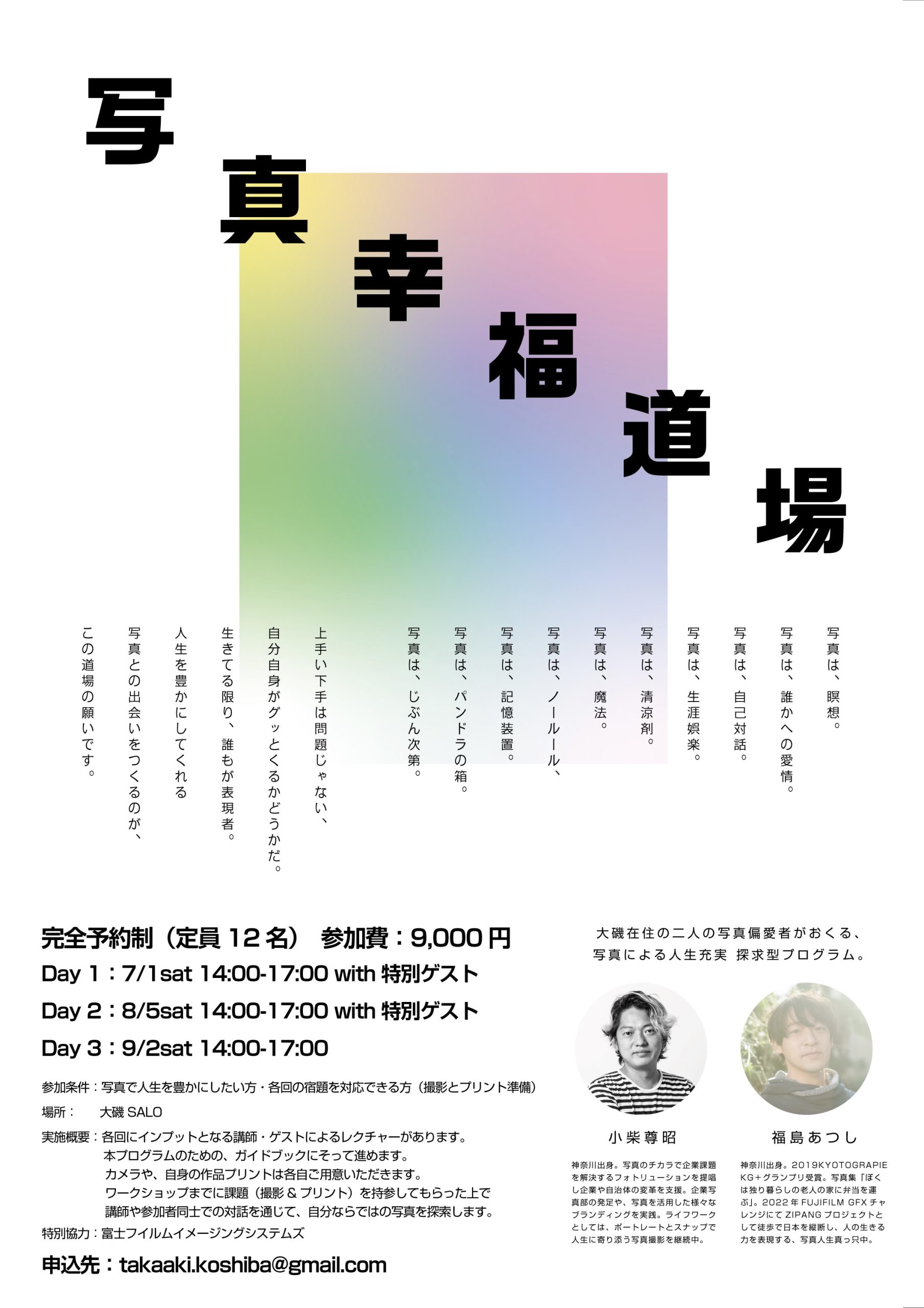 『写真を通じて自分の感覚・感性・心の声を認識し、自分の軸を芽生えさせ、幸せな瞬間との出会いを増やしていく』ことを目的に、全3回のワークショップ『写真幸福道場』を大磯在住の写真家小柴尊昭さんと開催いたしました。